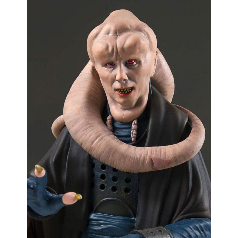 Diamond Gentle Giant LTD. It is unknown how long the Twi'lek known as Bib Fortuna has served as the majordomo to the mighty gangster Jabba the Hutt, but we know that his service dates back at least to the Boonta Eve Classic pod race, won by the young, unknown competitor Anakin Skywalker. The pasty-faced right-hand-man is still in Jabba’s service several decades later when the son of Anakin Skywalker returns to Tattooine as a Jedi and seeks to bargain with Jabba for the life of his friend. It is during that encounter that Jabba learns that Bib Fortuna is susceptible to “Jedi Mind Tricks.” Fortuna followed the rules of protocol in the Hutt's court (such as they were), and spoke only in Huttese, though he understood other tongues. The darkly robed attendant often hovered near Jabba's ear, offering advice and feeding information to his master. This 1:6 scale Bib Fortuna mini bust is painstakingly designed, modeled and prototyped using top of the line 3D technology so that no detail is missed. Each collectible mini bust is hand-cast, hand-painted and hand-numbered with a limited edition certificate of authenticity. The Bib Fortuna mini bust will be limed to only 750 pieces.
