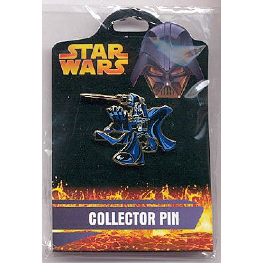 To commemorate the third and final episode in the Star Wars prequel trilogy, "Star Wars Revenge of the Sith", which opened in movie theaters on May 19, 2005, Lucas Films released a series of character and emblem pins. The character pins are presented in an animation style similar to the design shown on the Star War show on Cartoon Network. Each pin is hand-crafted in a process that begins with a flat piece of brass which is then die struck and filled with enamel color (referred to as "new cloisonne" which retains the characteristics of classic cloisonne while offering a much wider selection of colors). The surface is then polished to give it a smooth, durable finish. These pins were sold at Disney MGM Studios during Star Wars Weekends 2005 as well as at other retailers. This pin features the Dark Lord of the Sith, DARTH VADER, with light saber drawn for battle. All edged in gold. The pin is mounted on the Official Star Wars Collector Pin cardboard backing display. The pin itself is attached to backing display card with a black rubber clutch, which is also used to wear the pin. The back of the pin is gold and reads "Star Wars 2005 Lucasfilm Ltd and TM Pin USA". Original cellophane packaging.