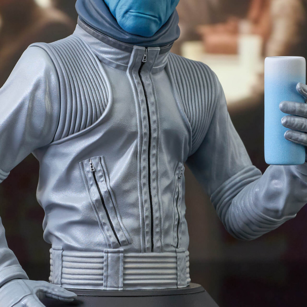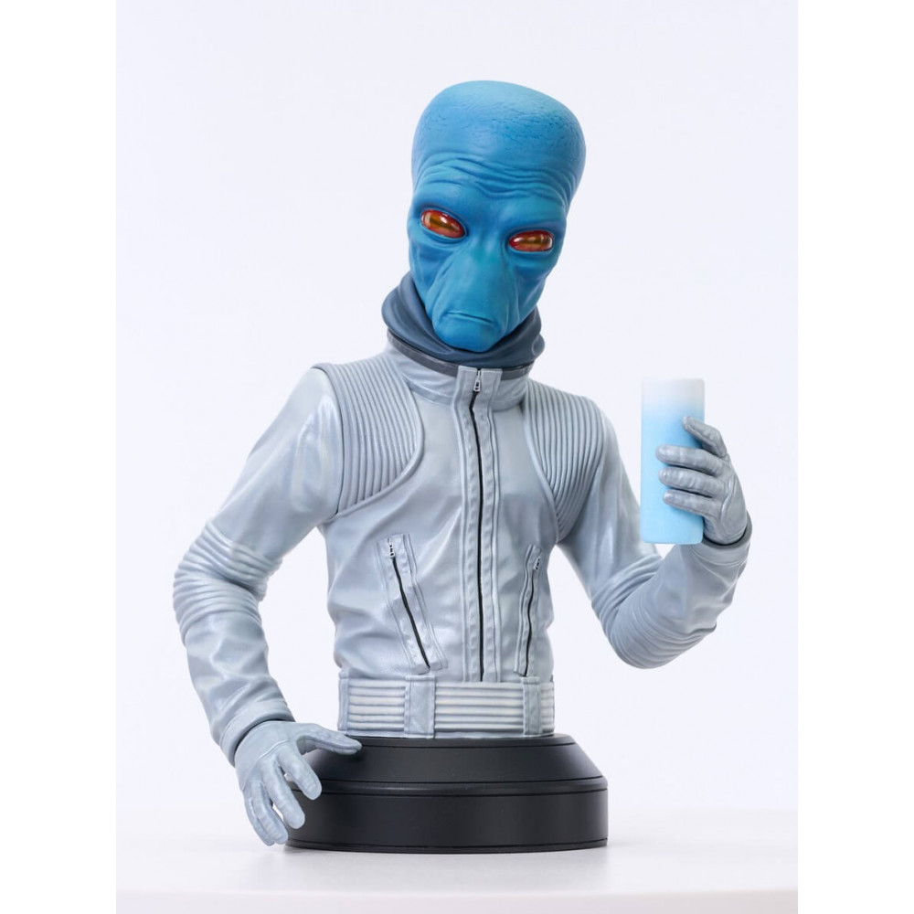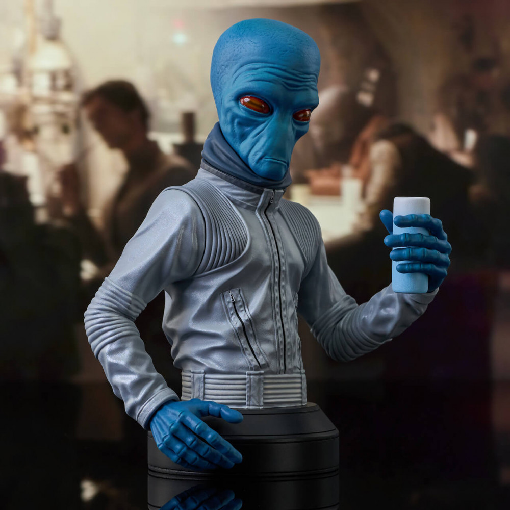 A Gentle Giant Ltd. release! It's Halloween again, and this year Gentle Giant, Ltd. is offering yet another creepy patron of the Mos Eisley Cantina! Joining Lak Sivrak and Labria, it's Ohwun De Maal a.k.a. Ellorrs Madak, the Duros alien who works as a freelance flight instructor and occasional smuggler. This approximately 6-inch mini-bust holds a drink in his gloved hand, but also comes with interchangeable ungloved blue hands, to reflect his two different appearances! Limited to only 500 pieces, he comes packaged with a numbered certificate of authenticity in a full-color box.