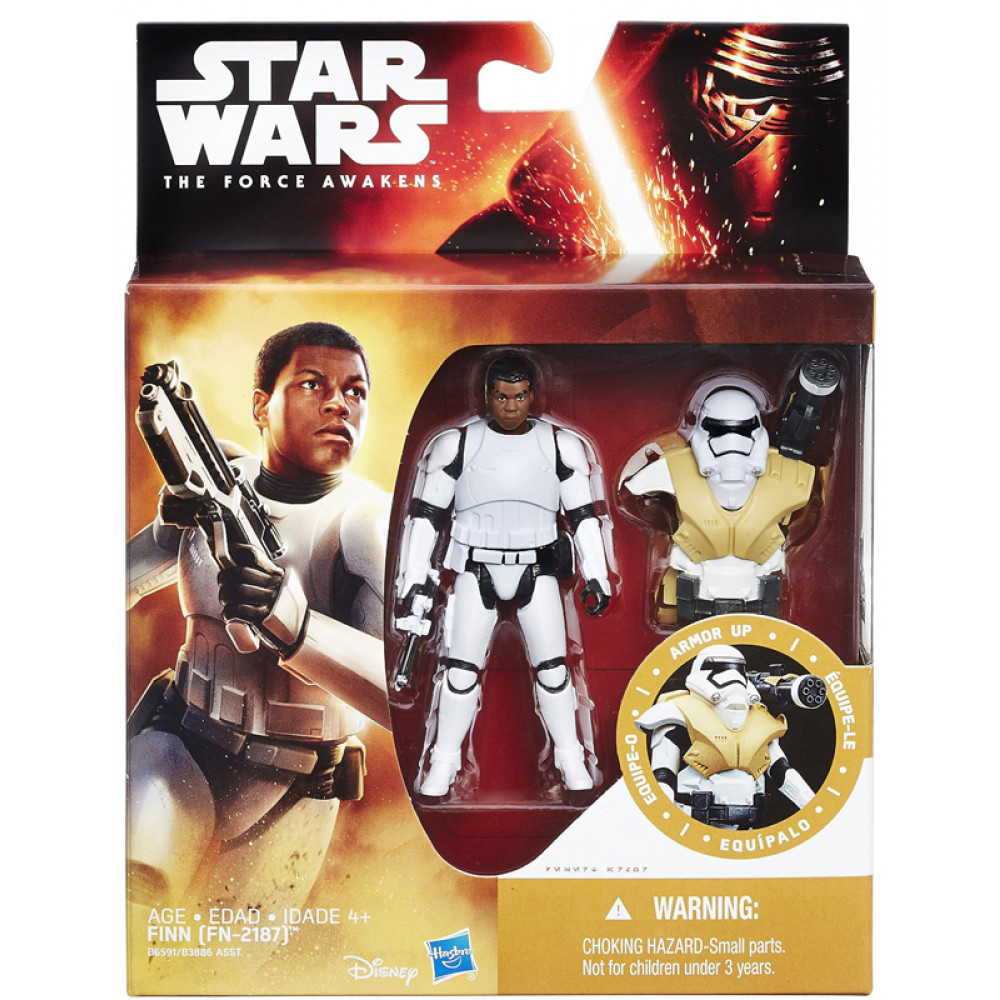 Hasbro - March 2016. Star Wars The Force Awakens Finn (FN-2187) Armor Up action figure 3.75 inches. Launch into action and adventure in the world of Star Wars! Discover the exciting stories of good versus evil in a universe of heroes, villains, and aliens. Let the mission set the story with specific armor and accessories to recreate an exciting action for each memorable character. After his first taste of combat during a brutal First Order night assault on a Jakku village, Stormtrooper FN-2187 defects from Kylo Ren’s forces, becoming a fugitive. This Finn (FN-2187) figure recalls specific scenes from Star Wars: The Force Awakens, and comes with 2 Desert Mission Armor accessories to ignite imagination. Collect and battle with these and other figures and vehicles from Star Wars.