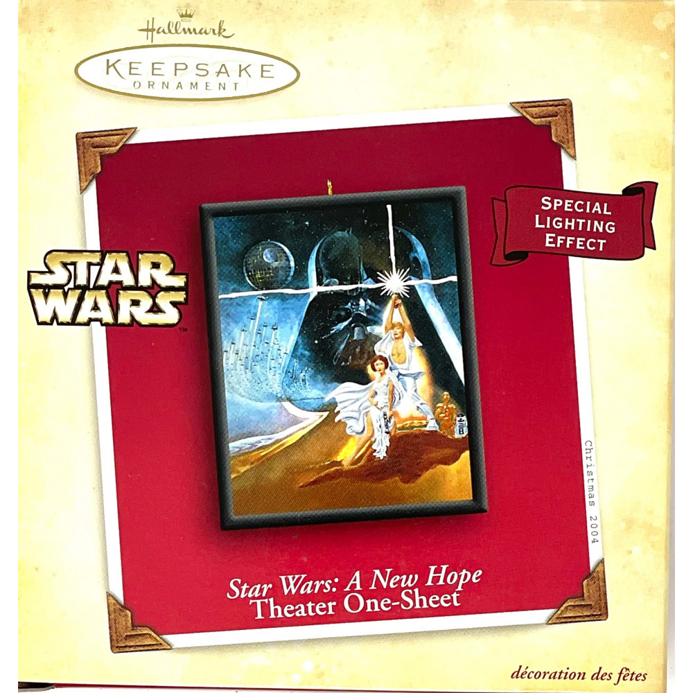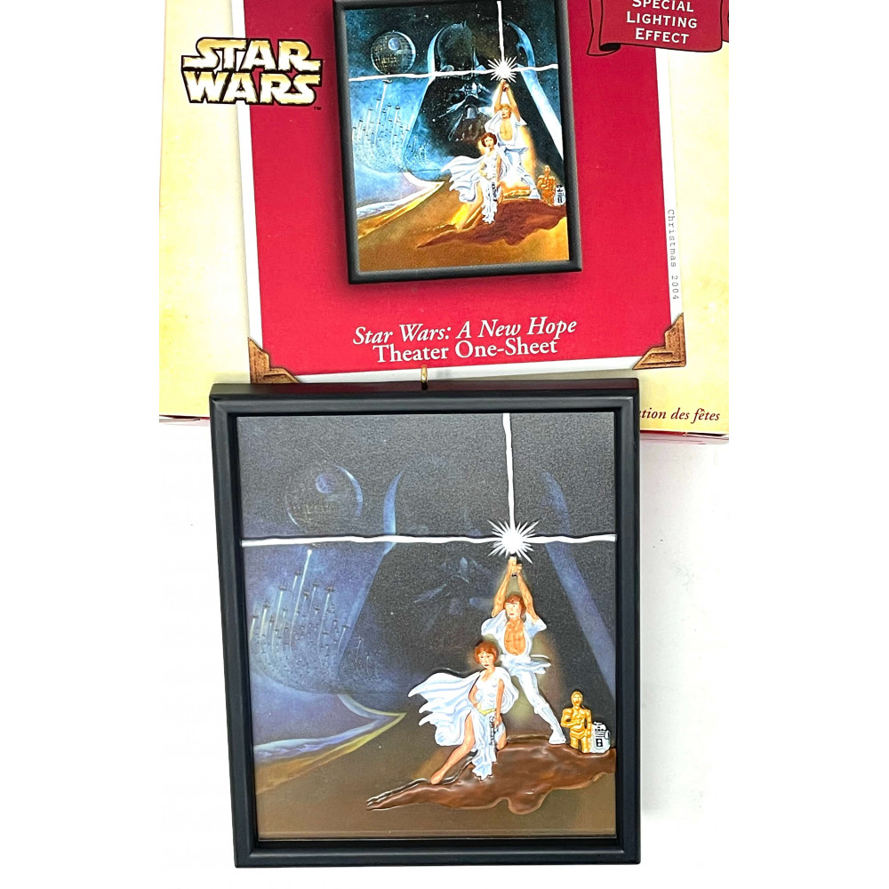 This Star Wars Hallmark Keepsake Ornament from 2004 features a theater theme from A New Hope. The ornament showcases special lighting effects and features iconic characters like Darth Vader and Princess Leia. The multicolor ornament is perfect for Christmas and any Star Wars fan. The set includes one ornament that is in new condition. It was manufactured in 2004 and is part of the Hallmark collection of ornaments. This item is a must-have for any collector or fan of the Star Wars franchise.