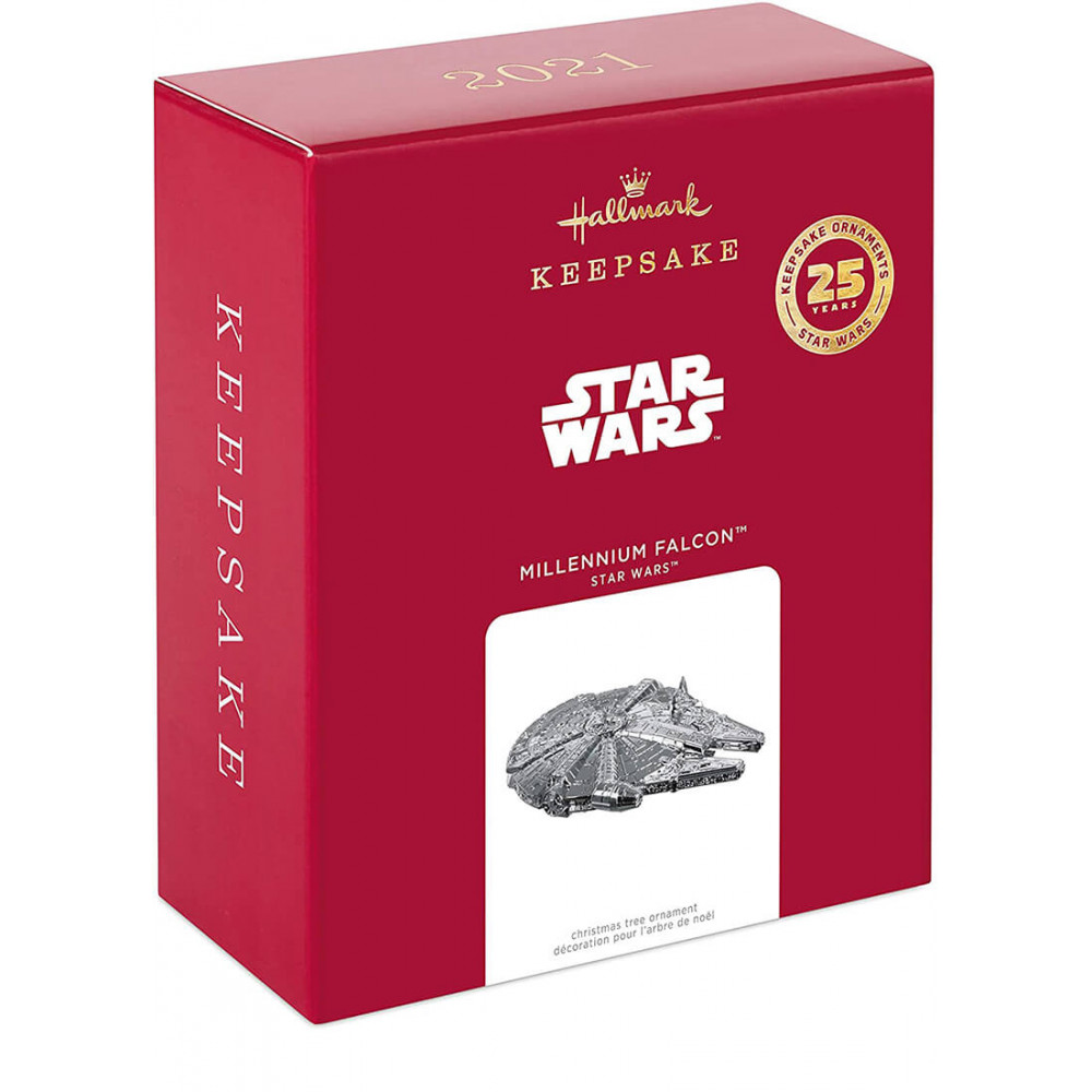 In 1996, Hallmark debuted its very first Star Wars Keepsake Ornament. Celebrate the silver anniversary of that milestone release with this premium metal Christmas tree ornament of Han Solo's iconic Corellian freighter, the Millennium Falcon, complete with a shiny chrome-like finish.
