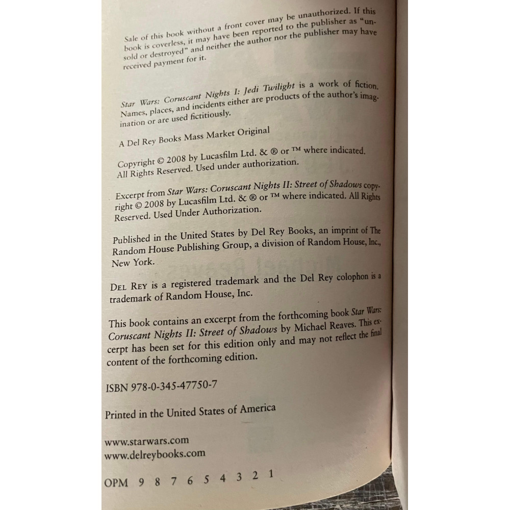 Del Rey Books. July 2006. Jedi Twilight (Star Wars: Coruscant Nights I) Paperback