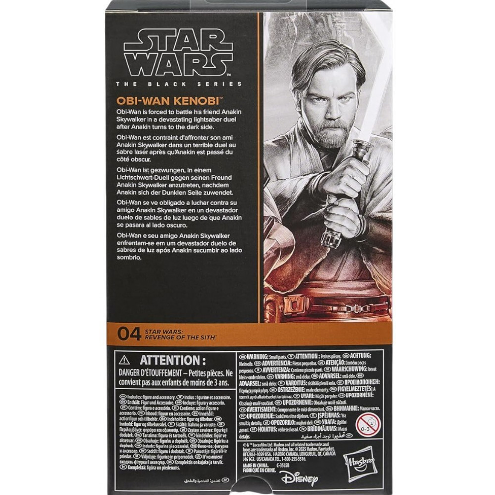 Star Wars The Black Series includes 6 inch action figures, vehicles, and roleplay items from the 40-plus-year legacy of the Star Wars Galaxy, letting fans create galactic scenes with a faithfulness to Star Wars comic books, movies, series, and more. This Star Wars Hasbro action figure is detailed to look like Obi-Wan Kenobi from Star Wars: Revenge of the Sith. With exquisite features and decoration, The Black Series embodies the quality and realism that Star Wars devotees love. May the Force be with you!