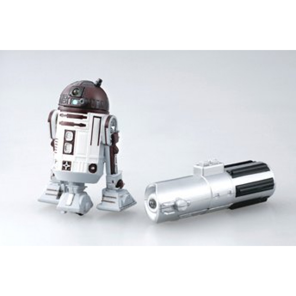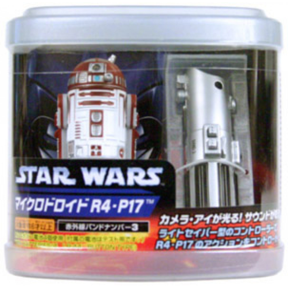 This miniature remote control R2-P17 from Japan is just about the same scale as the Hasbro action figure version, but includes all the bells and whistles (literally!) that has made R2 a favorite among fans. With the mini-lightsaber remote, R2-P17 will move forward or turn on command, rotate his dome as he rolls, beep and whistle, and illuminate his photo-receptor "eye". R2-P17 measures approximately 2.5" tall, and includes batteries for the remote and R2-P17 himself. Window box packaging attractively displays both R2-P17 and the lightsaber remote, and includes the stunning "Vader in Flames" graphics that mesh with the U.S. carded Episode III action figure line.