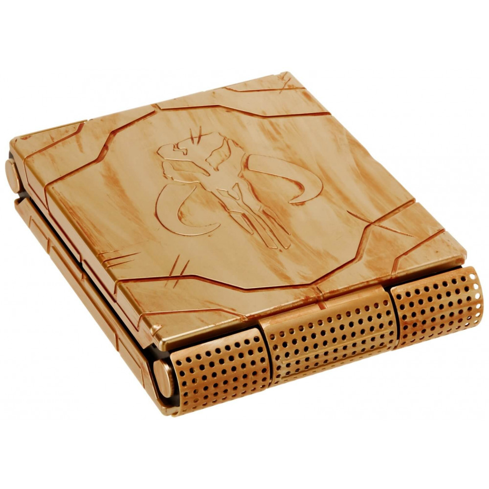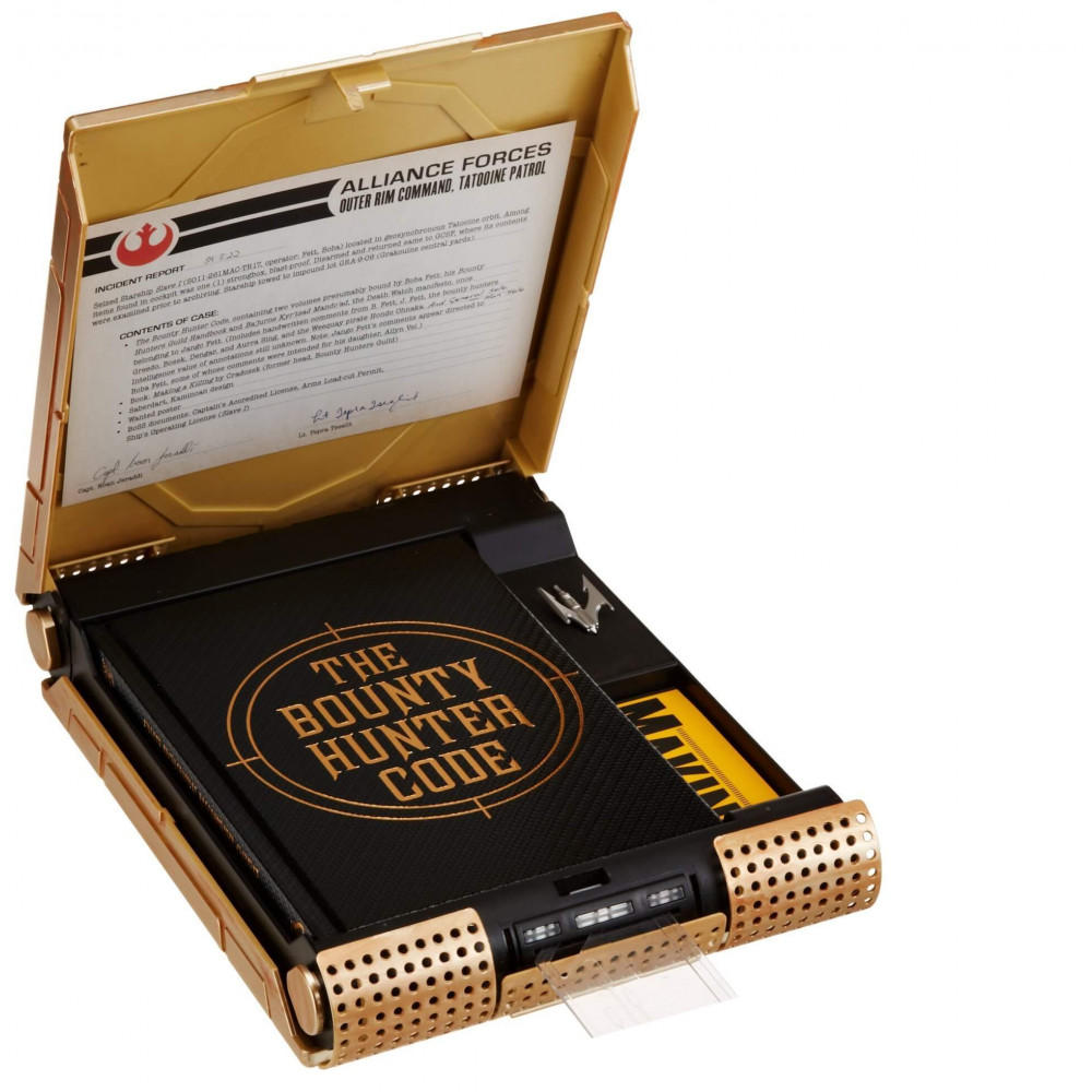 Press the buttons, insert the data card, and the case opens with sounds and lights. Housed within is a text of great import. At some point in his career Boba Fett bound together the latest edition of the Bounty Hunters Guild Handbook and a manifesto from Death Watch, the secretive splinter group of Mandalorians. Together, these volumes make up The Bounty Hunter Code.